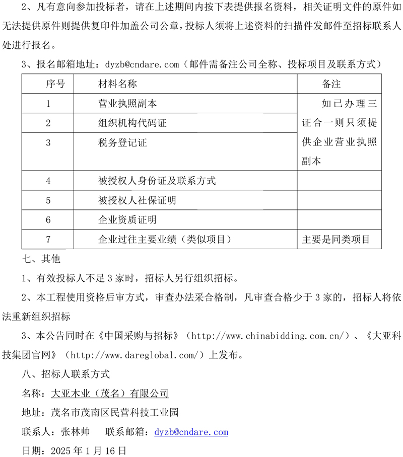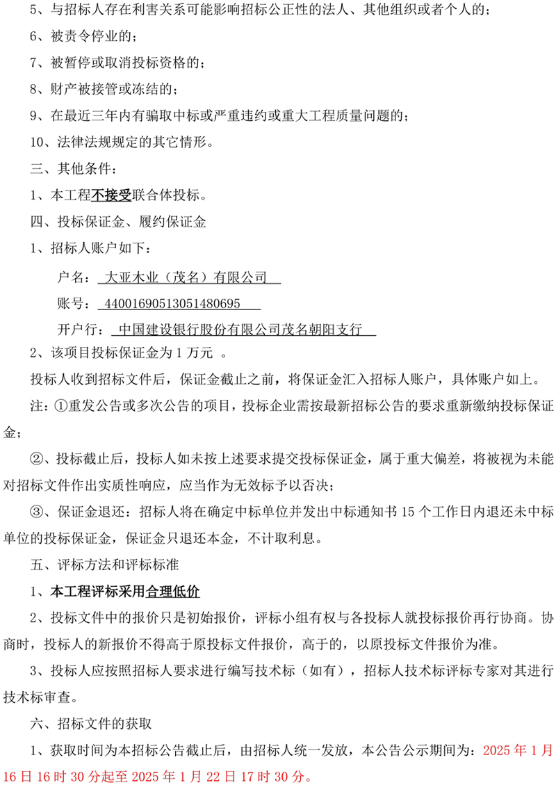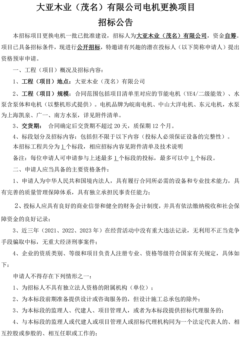 大亚木业(茂名)有限公司电机更换项目招标公告