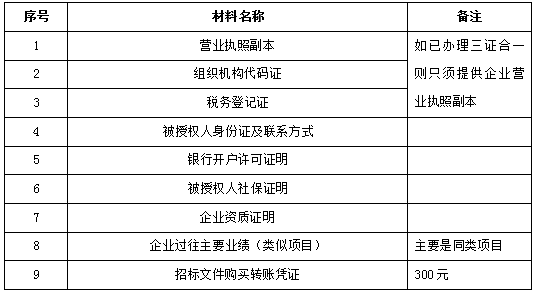 2、 凡有意向参加投标者,请在上述期间内按下表提供报名资料,相关证明文件的原件如无法提供原件则提供复印件加盖公司公章,投标人须将上述资料的扫描件发邮件至招标联系人处进行报名。