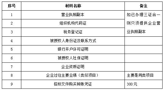 2、 凡有意向参加投标者,请在上述期间内按下表提供报名资料,相关证明文件的原件如无法提供原件则提供复印件加盖公司公章,投标人须将上述资料的扫描件发邮件至招标联系人处进行报名。