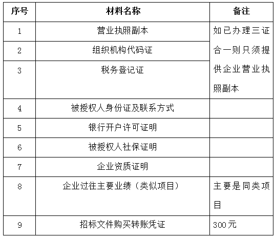 2、 凡有意向参加投标者,请在上述期间内按下表提供报名资料,相关证明文件的原件如无法提供原件则提供复印件加盖公司公章,投标人须将上述资料的扫描件发邮件至招标联系人处进行报名。