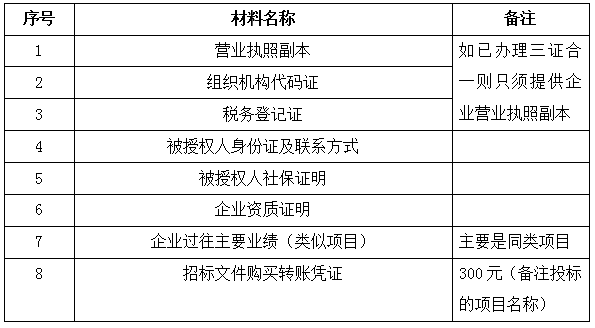 2、凡有意向参加投标者,请在上述期间内按下表提供报名资料,相关证明文件的原件如无法提供原件则提供复印件加盖公司公章,投标人须将上述资料的扫描件发邮件至招标联系人处进行报名。