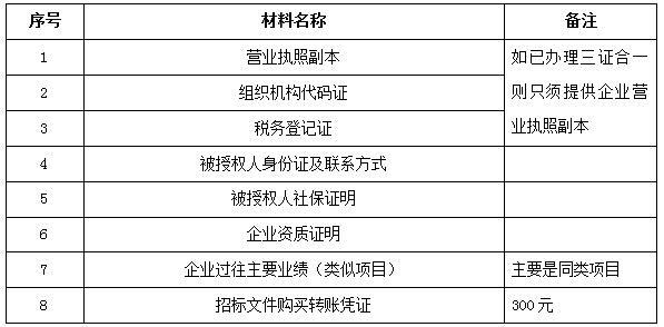 2、 凡有意向参加投标者,请在上述期间内按下表提供报名资料,相关证明文件的原件如无法提供原件则提供复印件加盖公司公章,投标人须将上述资料的扫描件发邮件至招标联系人处进行报名。