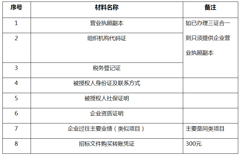 凡有意向参加投标者,请在上述期间内按下表提供报名资料,相关证明文件的原件如无法提供原件则提供复印件加盖公司公章,投标人须将上述资料的扫描件发邮件至招标联系人处进行报名。