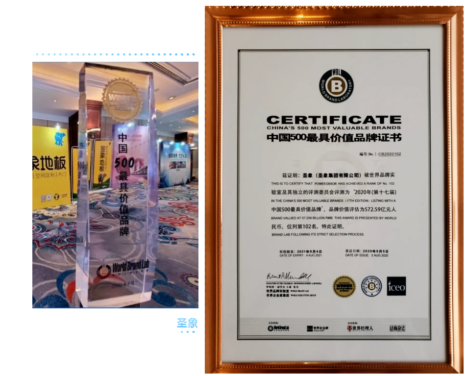 8月5日,由世界品牌实验室(World Brand Lab)主办的(第十七届)“世界品牌大会”在北京举行,会上发布了2020年《中国500最具价值品牌》分析报告。在这份基于财务数据、品牌强度和消费者行为分析的年度报告中,圣象以572.59亿元人民币品牌价值再次入选,荣膺第102位,继续领跑中国家居行业;大亚人造板以182.81亿元品牌价值蝉联中国人造板行业榜首,品牌排名322位,价值增幅15.2%。