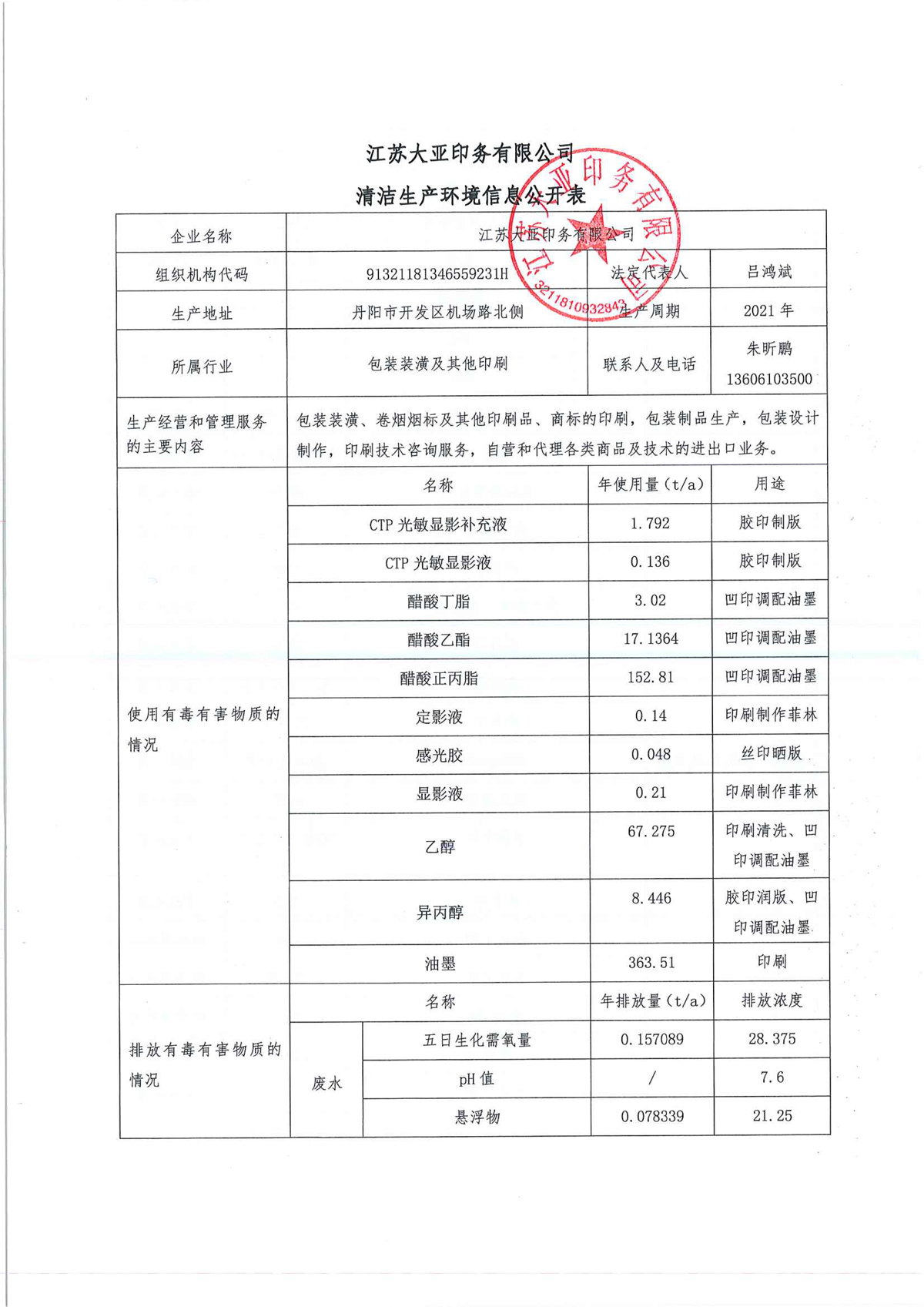 江苏大亚印务有限公司 清洁生产环境信息公开表